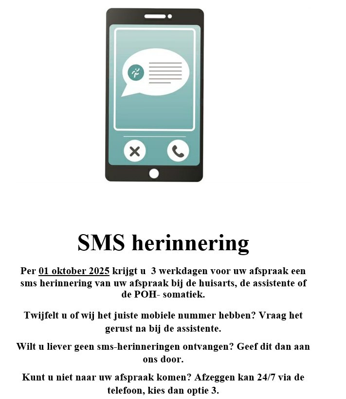 | Telefonisch spreekuur | Direct contact met de huisarts 14.00-14.30 uur |